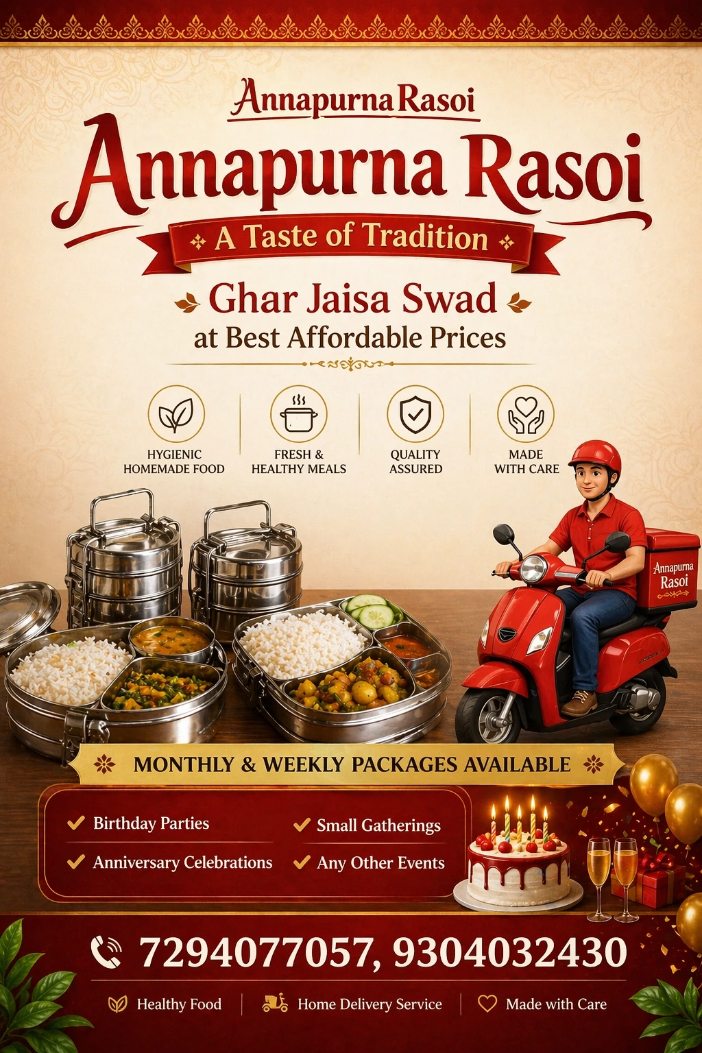 "We bring you fresh, hygienic, and home-style meals made with love. Whether it’s daily tiffin or special occasions, we serve happiness on every plate"